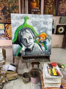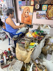 Vi pratade med konstnären och hans fru som båda var mycket trevliga. Hans namn var Virot. Efter en stunds samtal på begränsad engelska förstod vi att tavlan var ett beställningsverk av en svensk här på ön. Han visade även en annan påbörjad tavla även den beställd av en svensk. Det var fortfarande bara en skiss men man ser tydligt olika landmärken/platser från Stockholm och Göteborg.